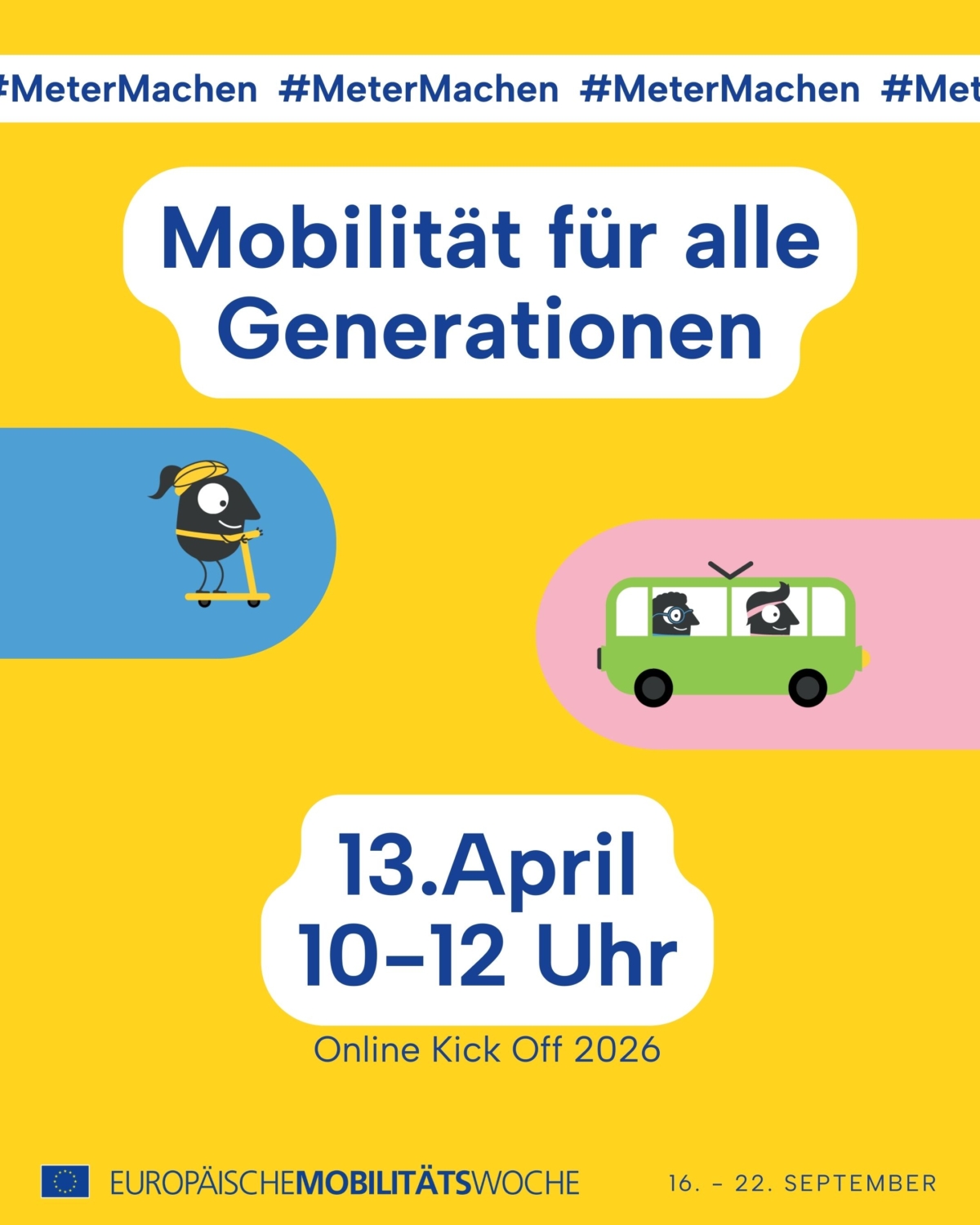Nach einer kurzen Einführung und Vorstellung der EUROPÄISCHEN MOBILITÄTSWOCHE werden wir Aktionsideen zum Jahresthema „Mobilität für alle Generationen“ und Materialien für die EUROPÄISCHE MOBILITÄTSWOCHE 2026 vorstellen.